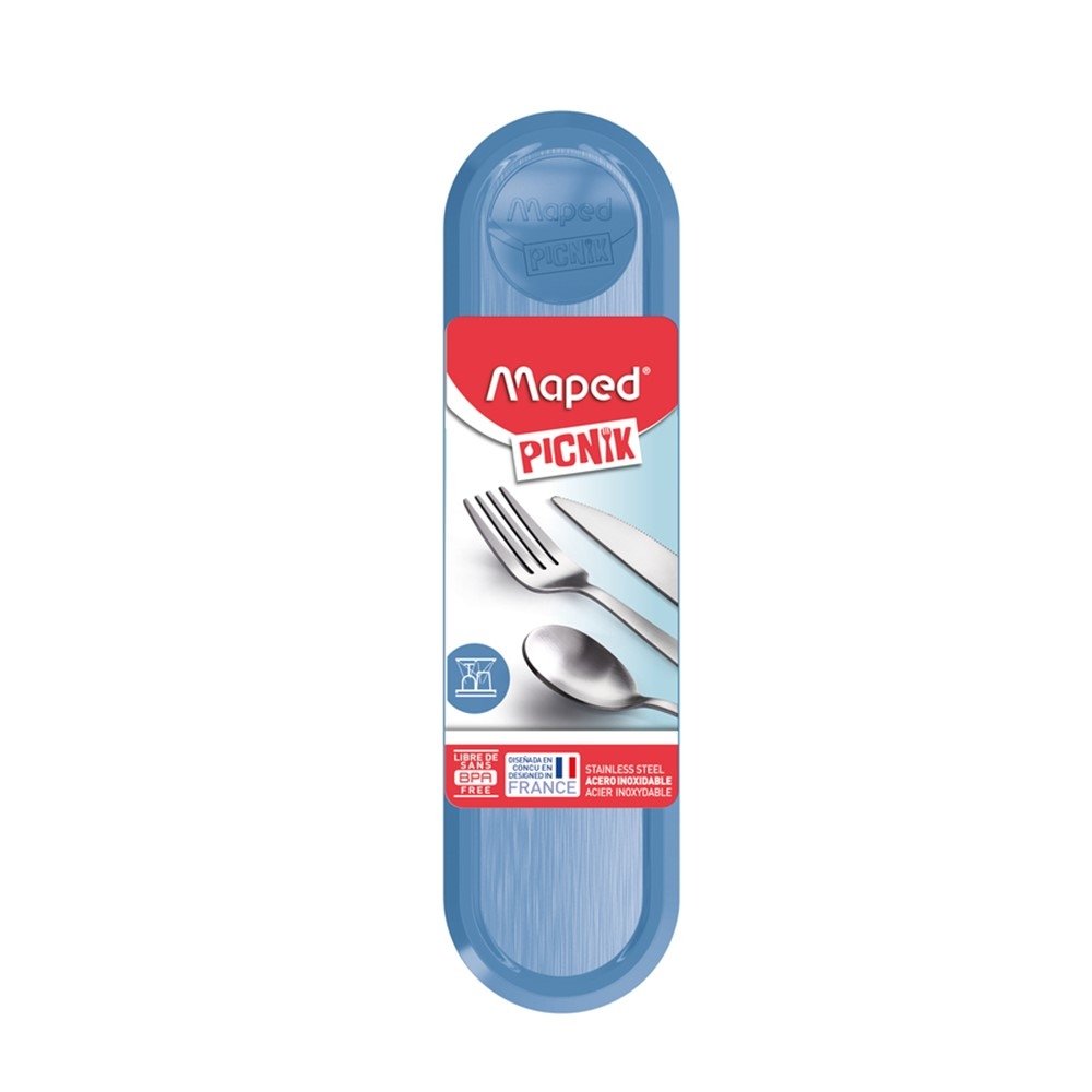 A caixa contém um garfo, uma faca e uma colher de aço inoxidável. Os talheres e a caixa podem ser lavados na máquina de lavar louça. Feitos para serem práticos para o uso diário, seja no escritório, em movimento ou num piquenique, os talheres são compactos, e podem ser facilmente guardados no Lancheira Maped Picnik no final da refeição.