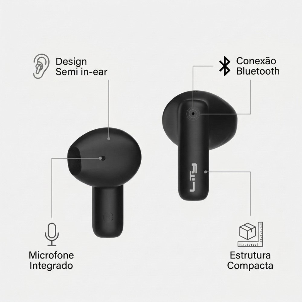 O Fone de Ouvido Lity T10P TWS foi feito para quem quer praticidade de verdade: colocar, conectar e sair usando. O formato semi in-ear entrega uma sensação mais leve no ouvido, ideal para acompanhar sua rotina com mais conforto - no trabalho, no transporte, na academia ou em casa.