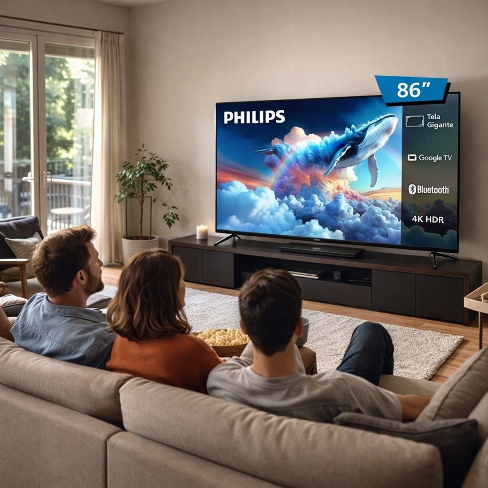 A Smart TV Philips 86” PUG7019 foi criada para quem busca imersão máxima em entretenimento. Sua tela gigante de 86 polegadas com resolução 4K UHD entrega imagens extremamente detalhadas, ideais para filmes, séries, esportes e jogos, mesmo em ambientes amplos.
