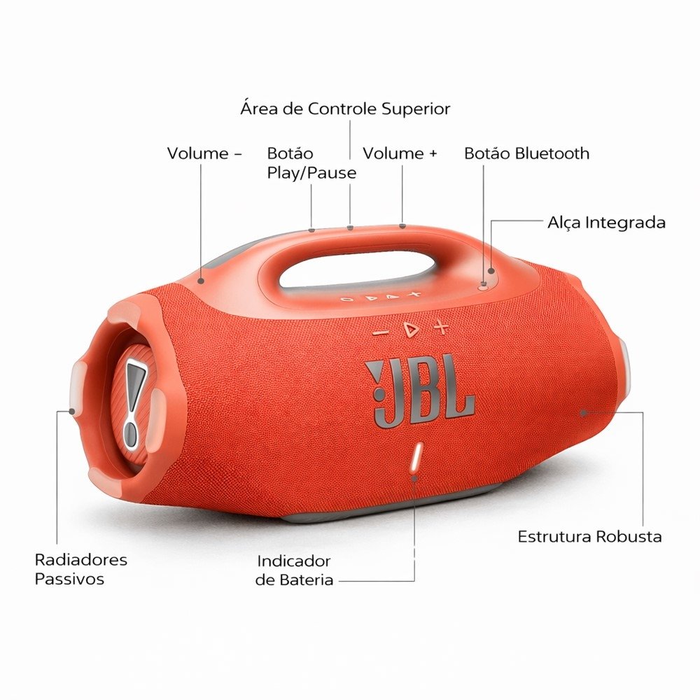Com design robusto, alça integrada e acabamento premium, a Boombox 4 combina potência, mobilidade e durabilidade em um único produto - ideal para quem não abre mão de qualidade sonora e confiabilidade.