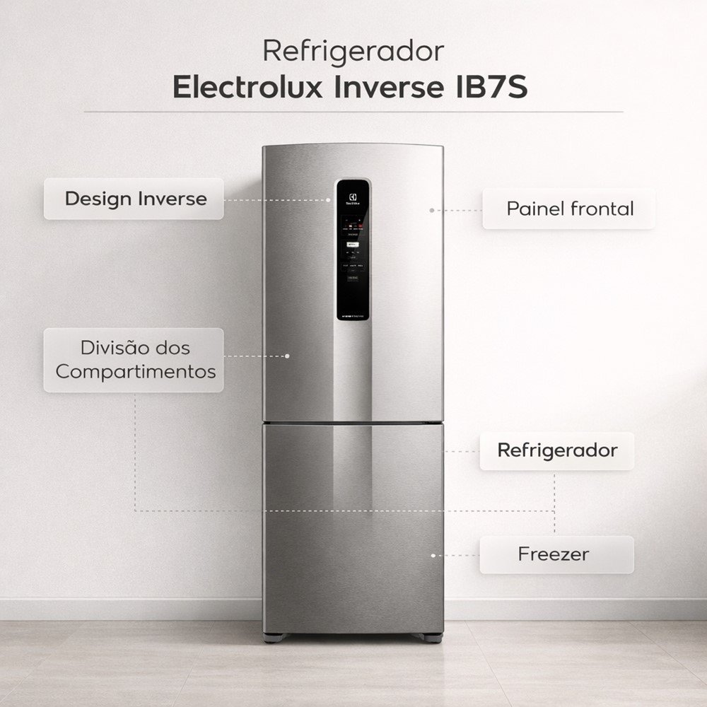 O Refrigerador Electrolux Inverse IB7S 490 litros foi pensado para deixar a sua rotina mais prática: com o formato Inverse, o refrigerador fica na parte de cima - ou seja, você acessa alimentos, bebidas e itens do dia a dia com mais facilidade, sem precisar se abaixar o tempo todo.