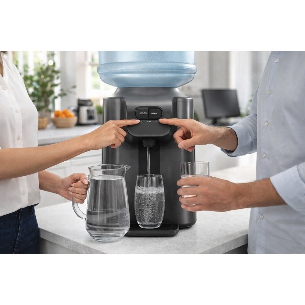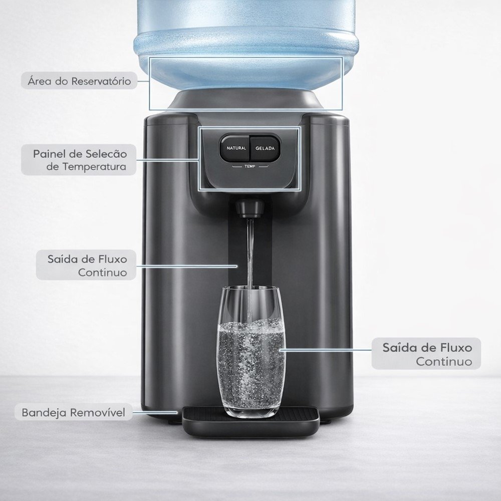 O grande diferencial está no sistema de refrigeração por compressor, pensado para quem valoriza água realmente gelada com consistência. Na prática, isso significa mais conforto em dias quentes, mais conveniência para receber visitas e mais agilidade para encher copos e garrafinhas ao longo do dia.